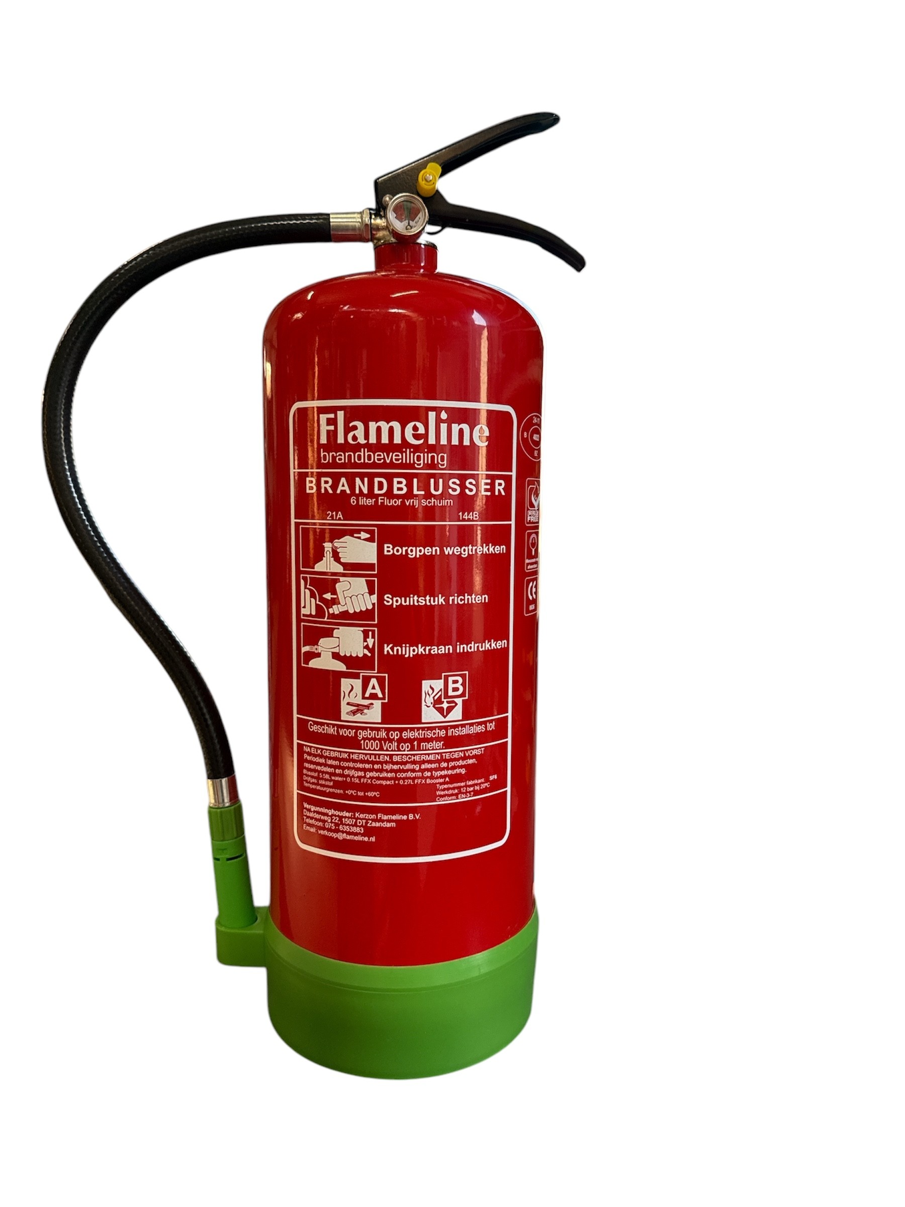 Voorzien van een duidelijke manometer en een RTK-nummer voor registratie en veiligheid. Bovendien is deze blusser elektrisch veilig tot 1000 volt, wat extra bescherming biedt bij gebruik in elektrische omgevingen.